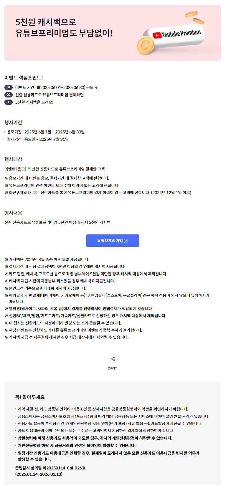 이벤트 [응모] 후 신한 신용카드로 유튜브프리미엄 결제한 고객